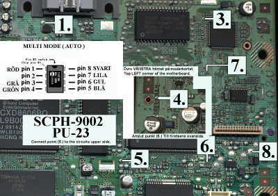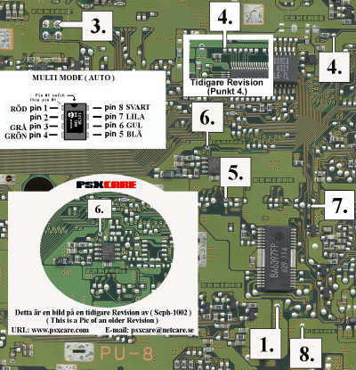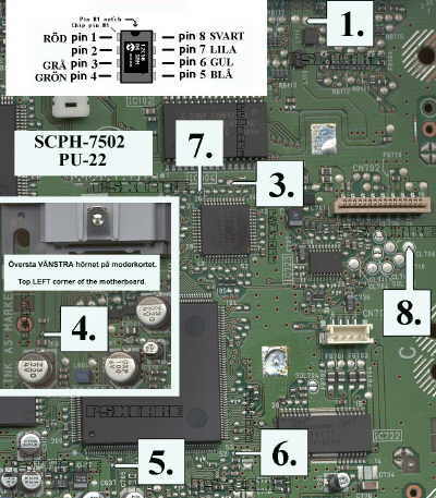 På modell SCPH-1002 och SCPH-5502/5552 måste man skruva ur och vända på moderkortet, på övriga modeller löder man på ovansidan.