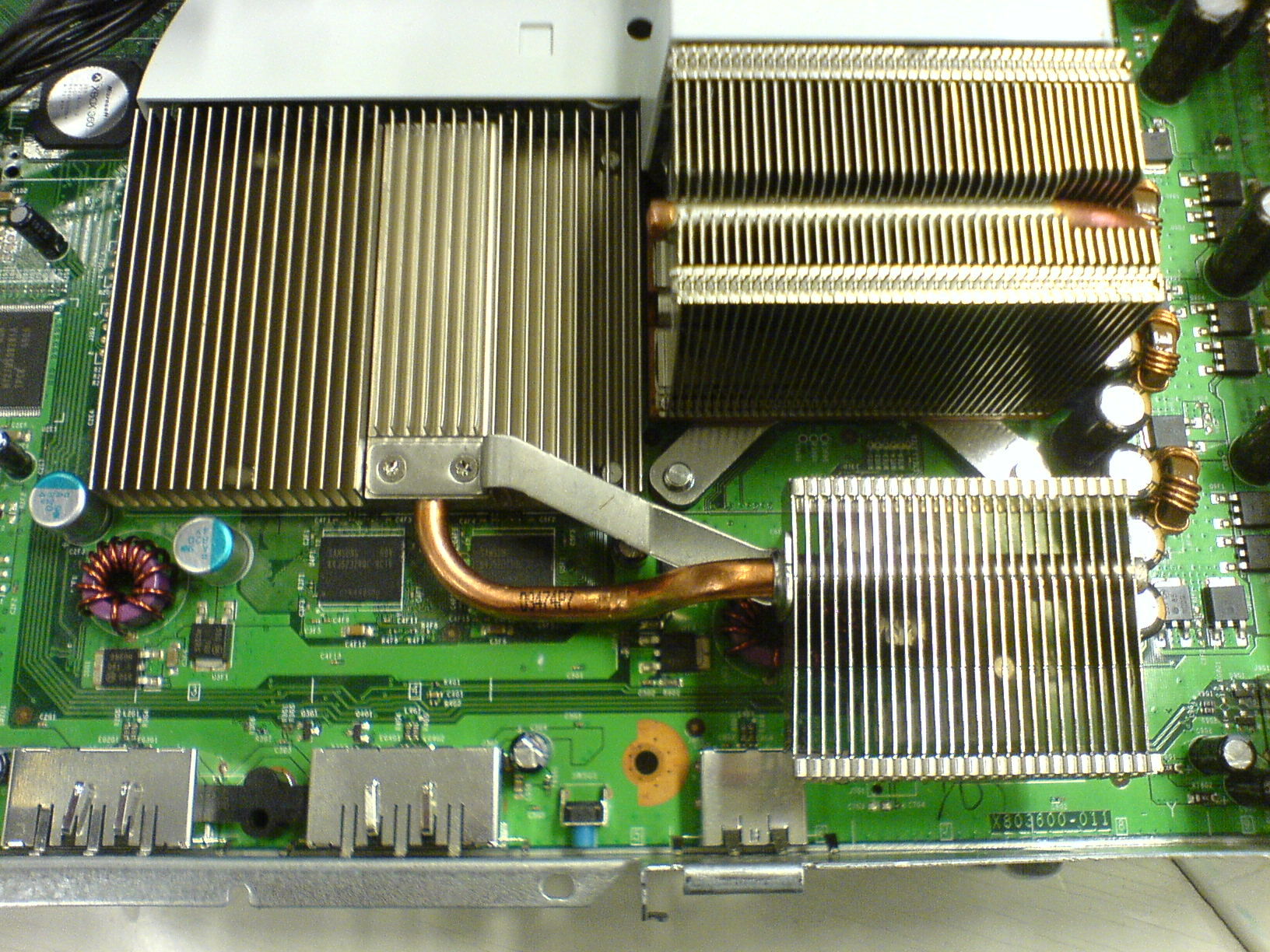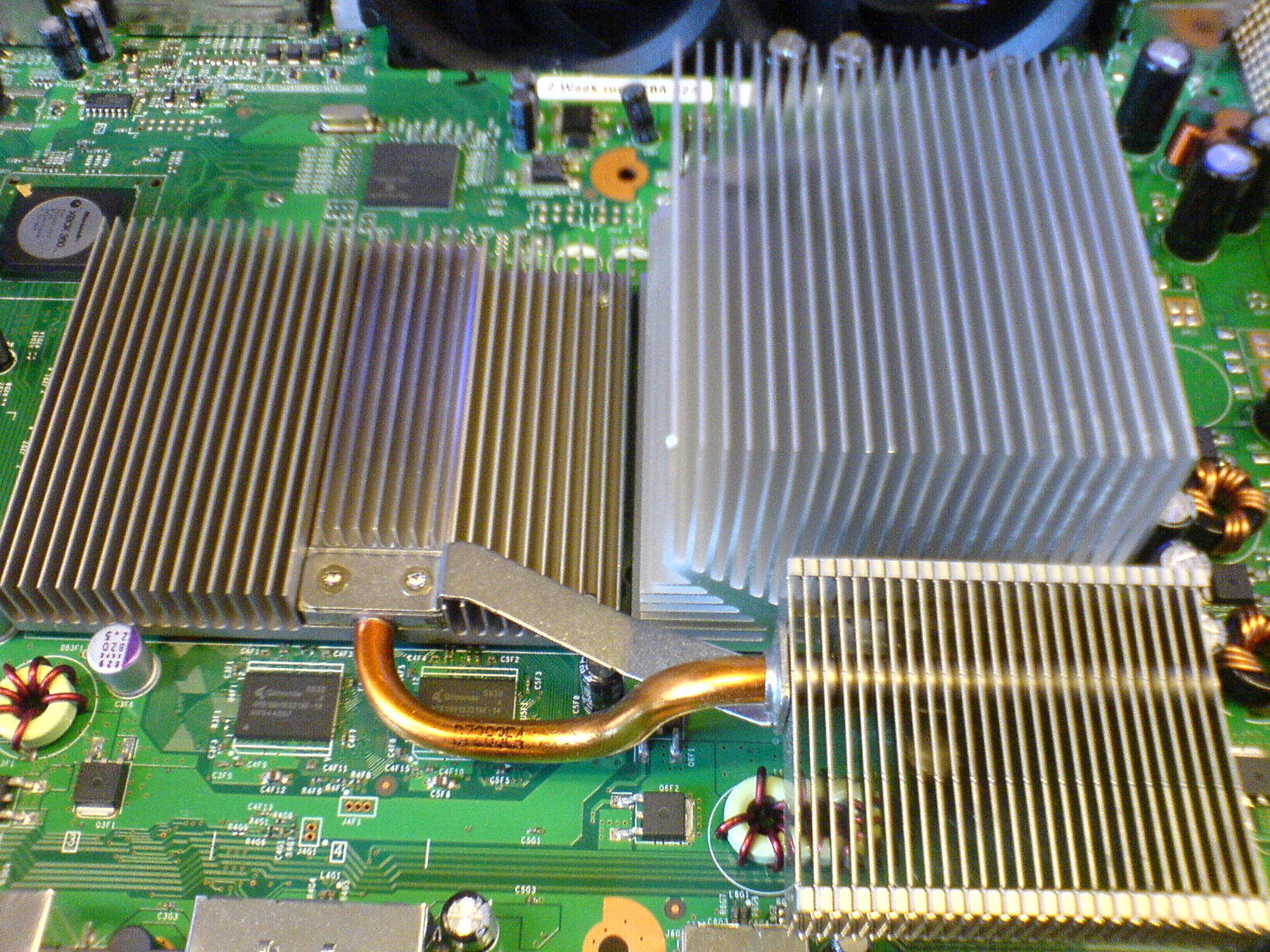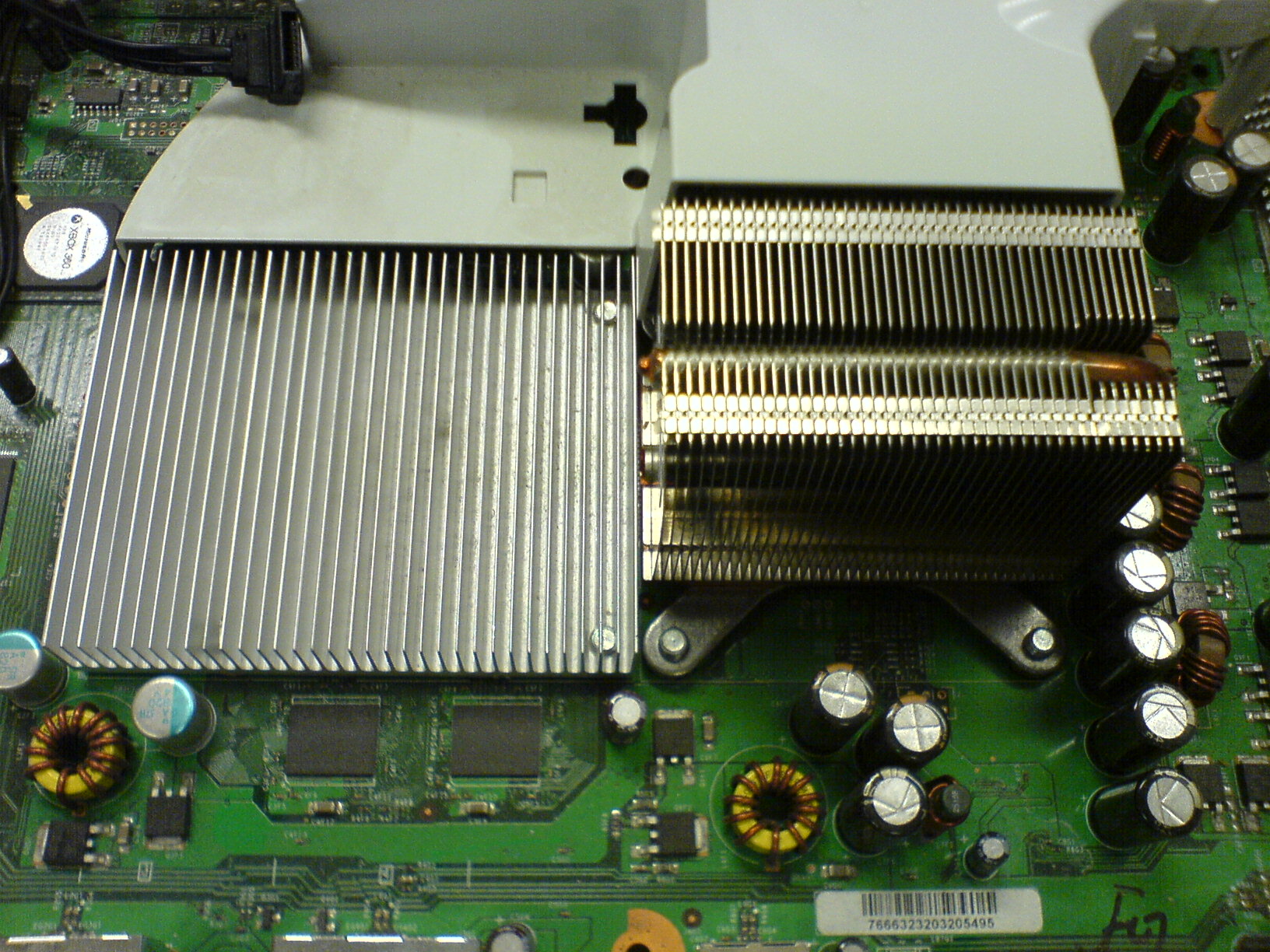 Bild 2 = Gamla kortet efter MS RROD fix, notera den extra förstärkta GPU kylflänsen och den fortfarande kopparrörs genomborrande CPUn