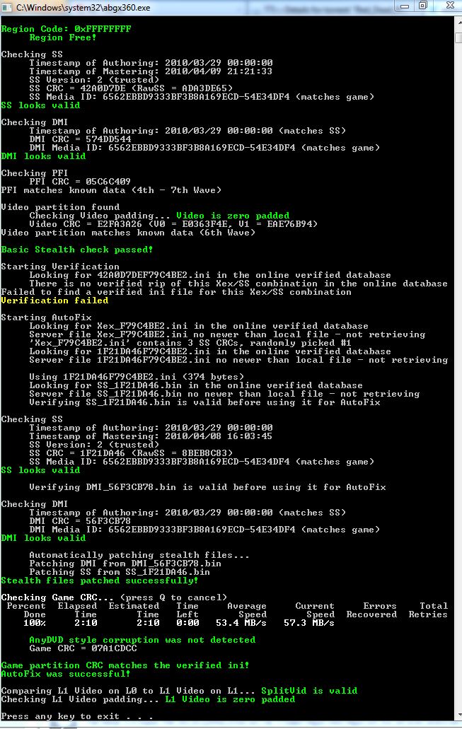 Laddade ner Alan Wake [XBOX360] [MULTI9] [REGION FREE] och körde som vanligt abx360 för att se om allt var som det skulle. Dock så fick jag upp denna [ATTACH=CONFIG]1167[/ATTACH] och då ser jag att det står " Verification failed" och saknar alla dessa "matches" som händer en bit ner, som ni ser på denna bild(annat spel, mass effect): [ATTACH=CONFIG]1168[/ATTACH]