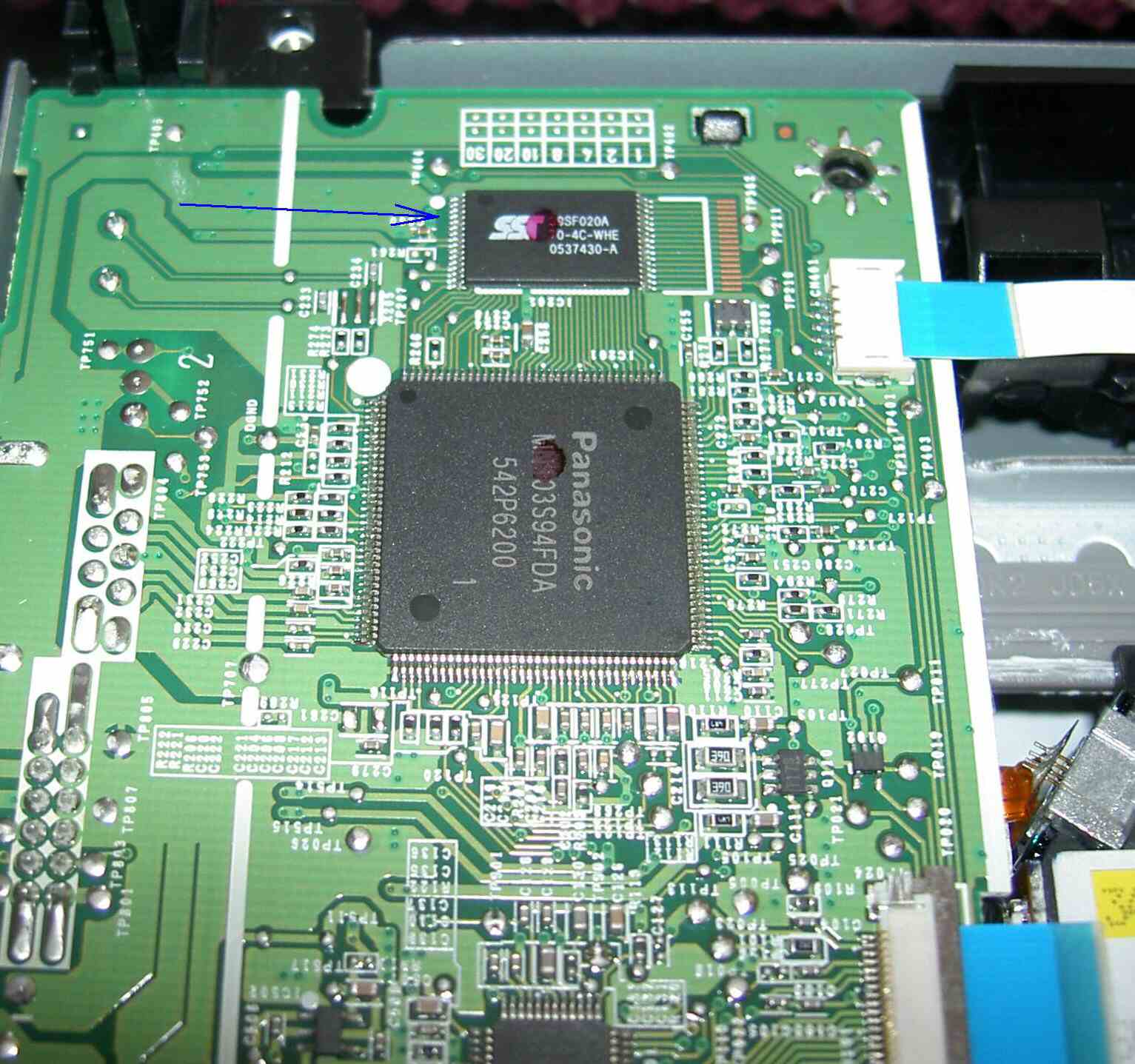 Har tagit ett kort på styrkortet i DVD som jag föröker dra en länk till nedan. Har även ritat en fin pil till minnet (antar att det är så) som håller FW. Nån som har en bra ide hur man löder bort det? Behöver man bra specialutrustning kanske? Läste nån som föreslog varmluftpistol men vet inte om det är en bra ide?