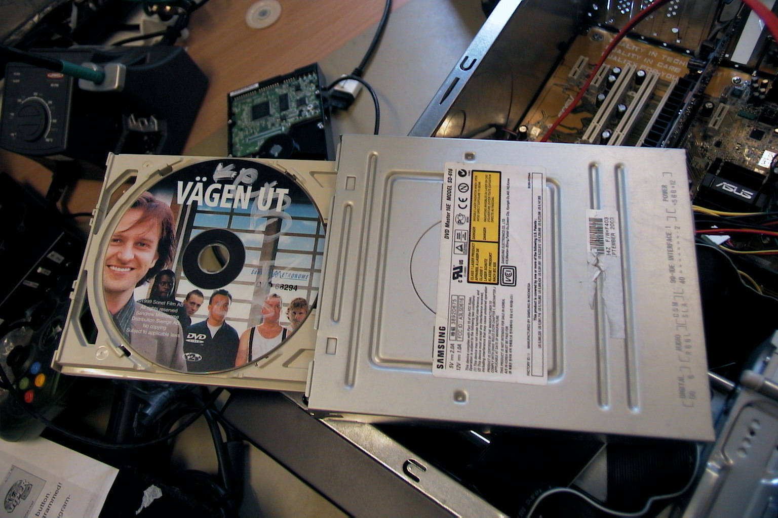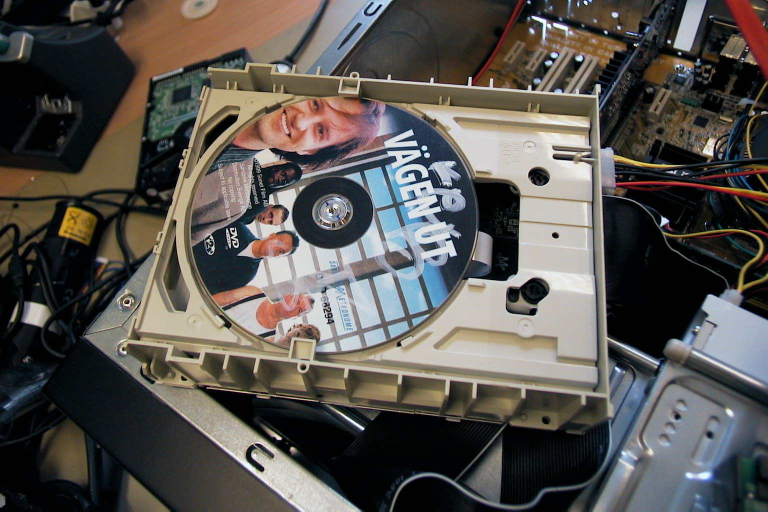 Skruva isär din dvdläsare så att du kan byta skiva i läsaren utan att behöva trycka ut släden. Koppla in den till datorn och kolla att den fungerar. Tänk på att du måste kunna ha den hyffsat ihopsatt när du använder den så att skivan hålls fast som den skall, samt kunna öppna/sätta ihop den när den är igång.